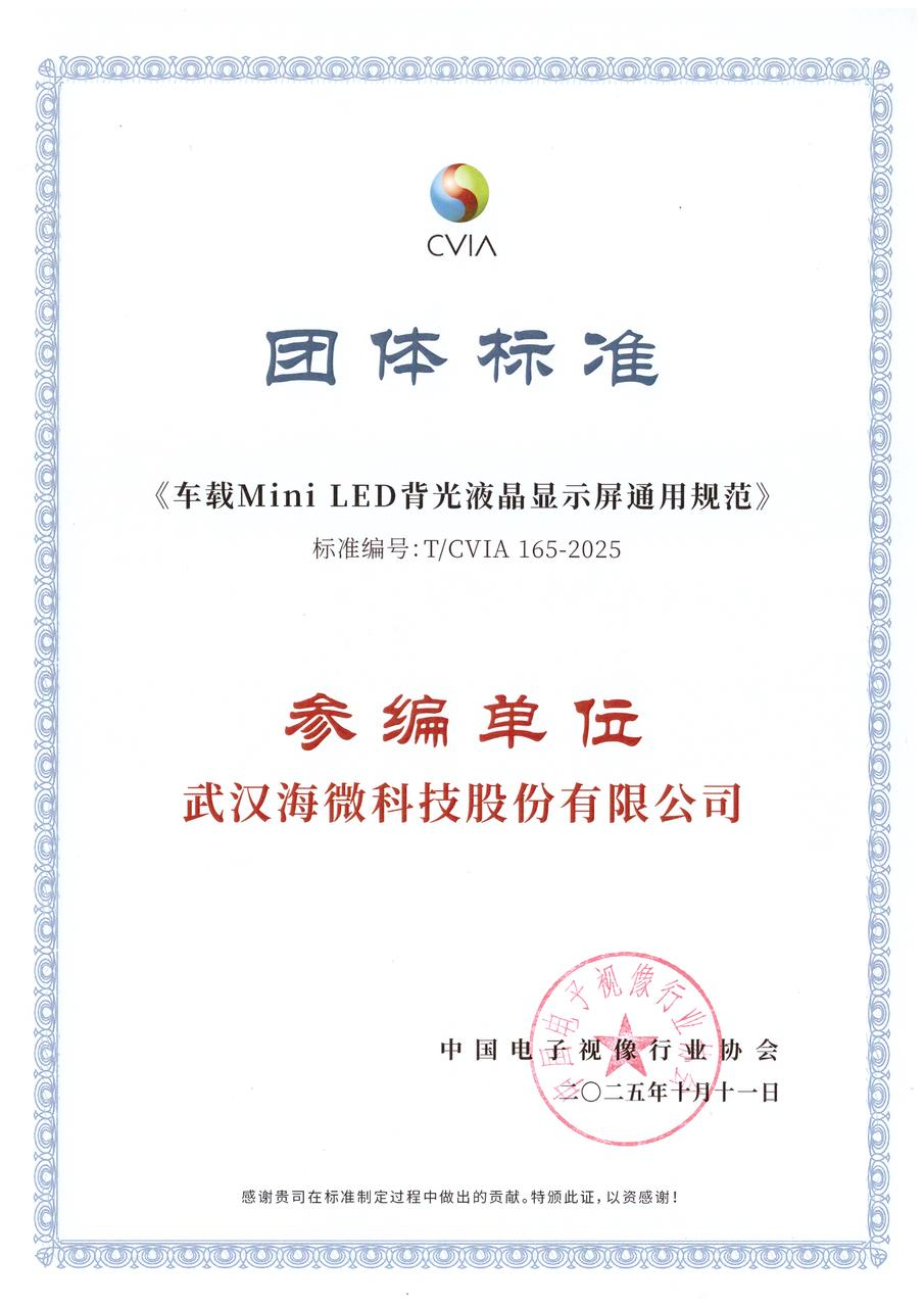近日,由中国电子视像行业协会联合产业上下游共同制定的 《车载Mini LED背光液晶显示屏通用规范》正式发布。作为车载显示领域的领军企业,海微HIWAY凭借其在Mini LED技术领域的深厚积累和前瞻布局,深度参与了该标准的起草与编制工作,与行业伙伴共同树立了车载Mini LED显示的技术标杆。
