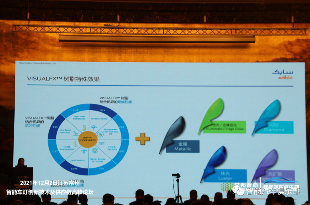一般而言,车灯由反射镜、透镜、壳体/光源、电子电路、及安装配件等构成,我国汽车车灯用主要塑料原料有PC、PP、ABS、PMMA和少数其它塑料材料。在本次论坛上吴经理从SABIC公司介绍、车灯外观特殊效果材料介绍等方面给大家介绍了特殊视觉效果在车灯的解决方案。