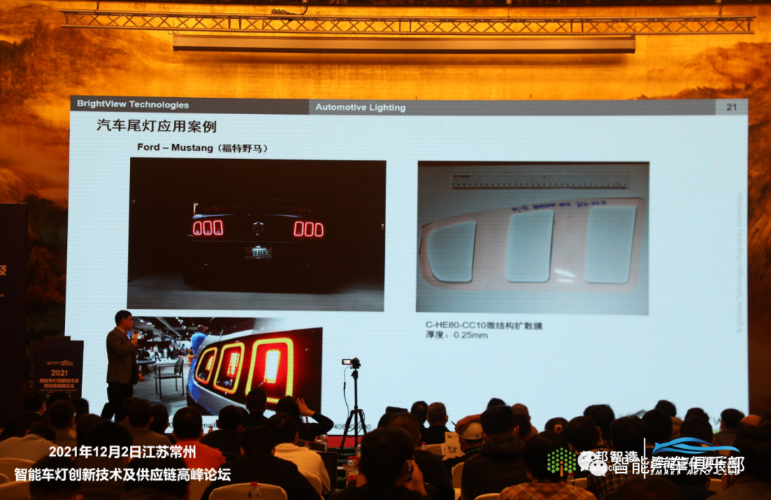 在本次论坛上康煜科技陈总公司介绍、产品介绍、产品应用、技术能力等方面给大家详细介绍了微结构膜在汽车车灯的应用。