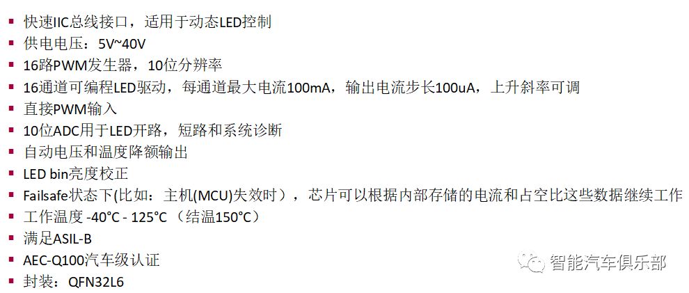 基于LIN总线的氛围灯控制器一般用于对颜色要求高的场合,比如室内氛围灯。而对于车外的彩色指示灯,其需要的工作电流大,但是颜色要求比较低,可以采用线性恒流驱动芯片。