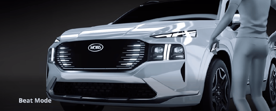 现代摩比斯的“Lighting Grill”可以把RGB彩色LED排列在格栅内部,可以在车外饰上显示欢迎/迎宾动画,还可以显示离车动画等等人车互动内容。RGB彩色 LED可以很轻松地实现任意颜色的调整,可以显示彩虹上的或者调色盘上各种各样的丰富色彩。不过,为了满足法规的要求,行车过程中只被允许显示白色,目前只能在停车的时候显示其他颜色。