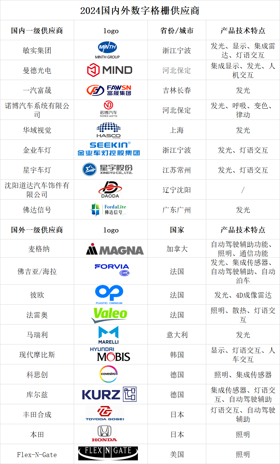 今天小编为大家整理了国内外汽车数字格栅一级供应商相关信息,一起来看看吧!(表格排名及不分先后,如有遗漏,欢迎补充)